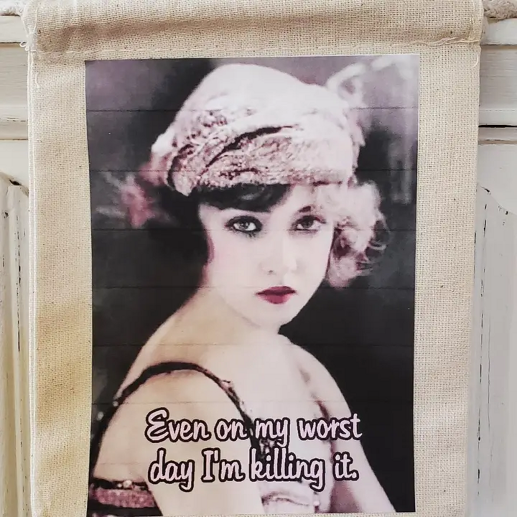 This is a lovely cotton canvas draw string gift bag pouch that reads: Even on my worst day I'm killing it. Perfect to give to that special person.